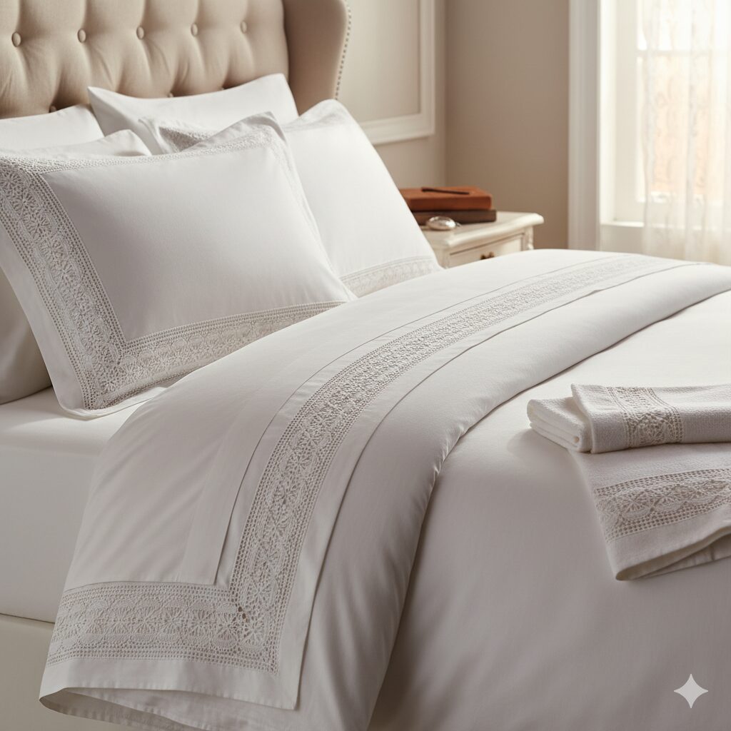 A técnica "Grand A-jour" é o padrão ouro na decoração de interiores. Casas de prestígio como a Rivolta Carmignani aplicam esta técnica em cetim de algodão puro de 600 fios (600TC). Esta contagem de fios não é apenas um detalhe técnico, é a garantia de uma luminosidade e suavidade que transformam o ato de dormir numa experiência de hotelaria de luxo. O ajour em lençóis de linho puro eleva objetos domésticos ao estatuto de herança, destinados a atravessar gerações.