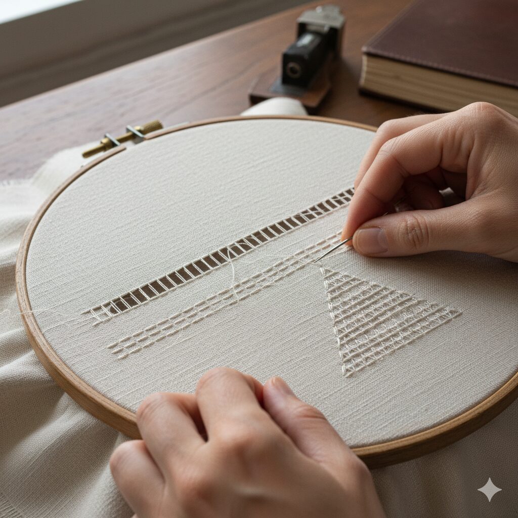 • O Processo de Desfiar: Após a marcação, os fios são retirados um a um, criando o canal para a intervenção da agulha.