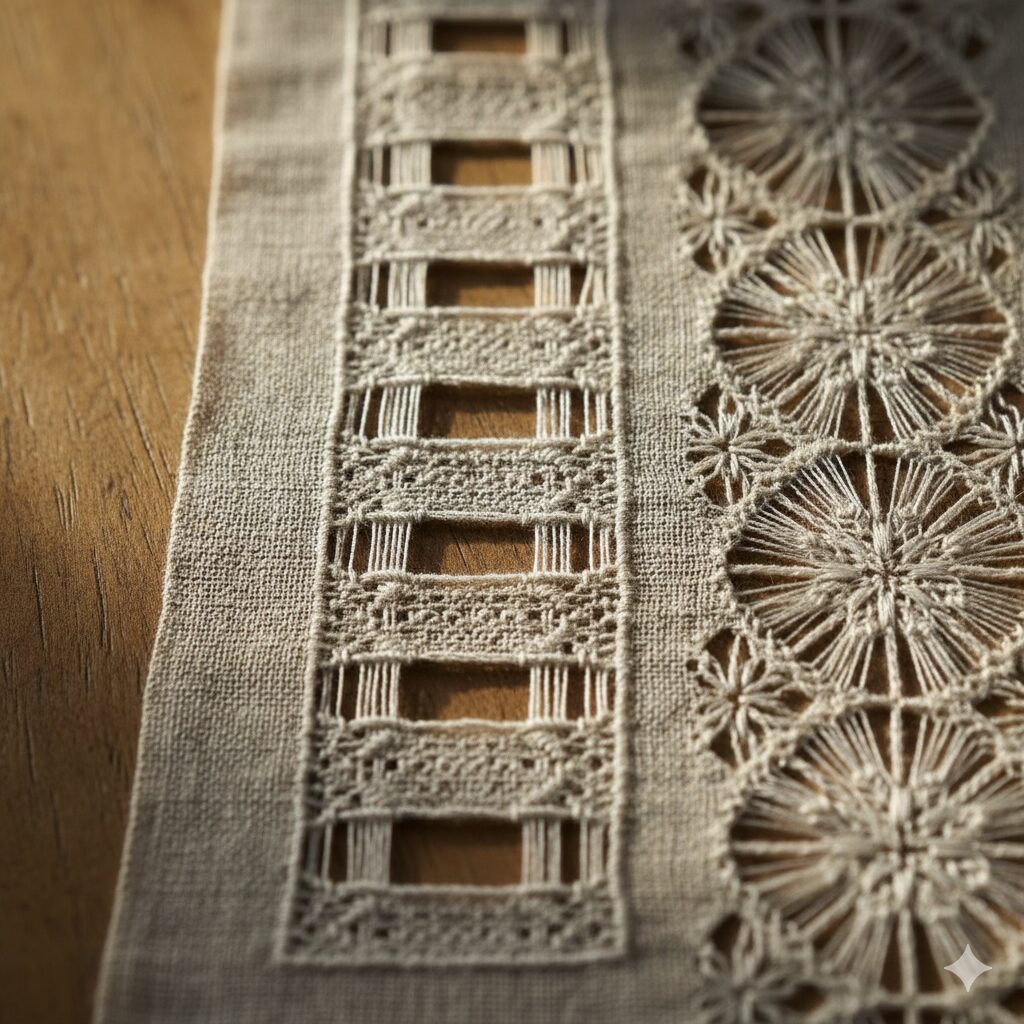 • Desfiado (Punto Tirato): A intervenção física onde fios da trama ou urdidura são deliberadamente retirados, deixando colunas de fios que serão a base para a ornamentação.
