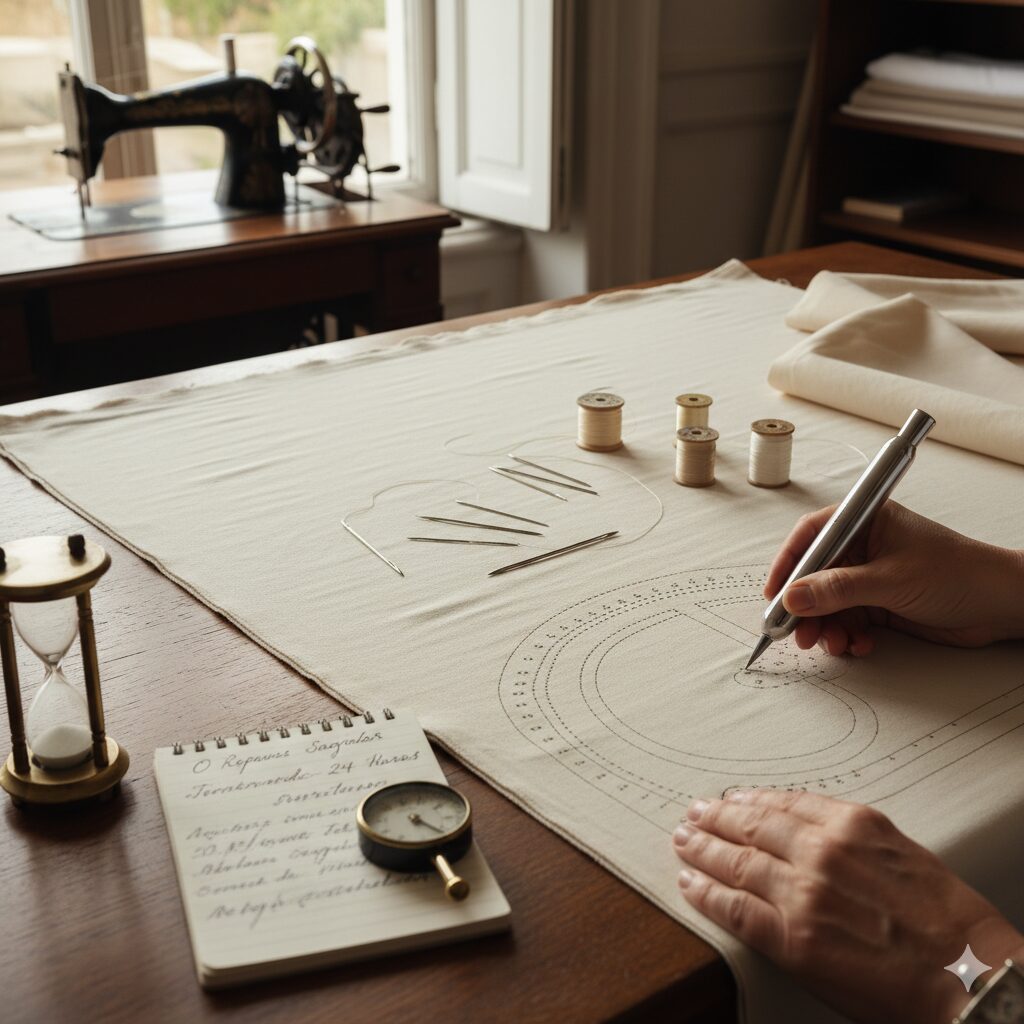 • O Repouso Sagrado: O tecido deve repousar por 24 horas antes de qualquer marcação. Este tempo é vital para que as fibras se estabilizem, evitando que o viés deforme o desenho final.