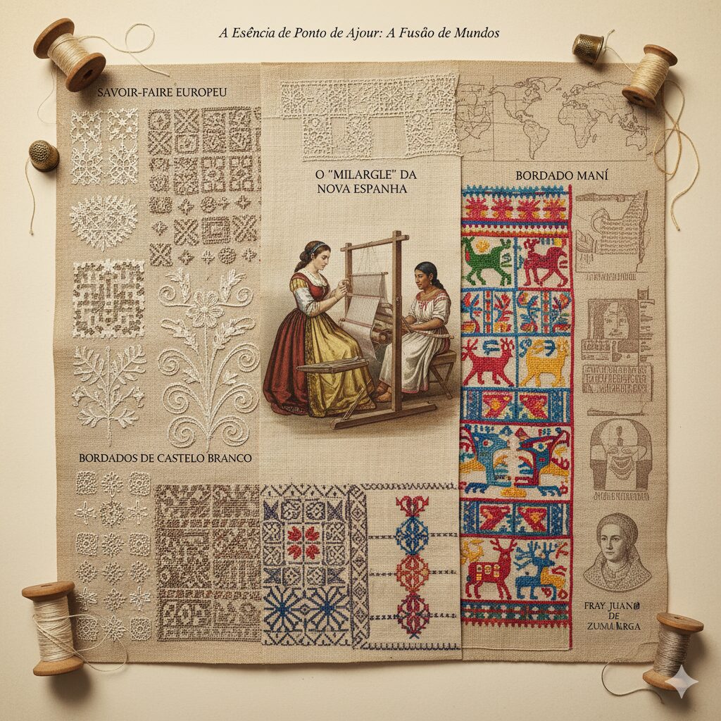 • O "Milagre" da Nova Espanha: Sob o aviso de Fray Juan de Zumárraga, a Rainha Isabel de Portugal (esposa de Carlos V) enviou de Castela mulheres devotas para instruir as populações indígenas nos ofícios "mulheris". O que poderia ser uma simples lição de evangelização tornou-se uma simbiose técnica sem precedentes. As mulheres indígenas, que já "teciam maravilhosamente" no milenar tear de cintura (backstrap loom), absorveram o bordado europeu com uma destreza superior.