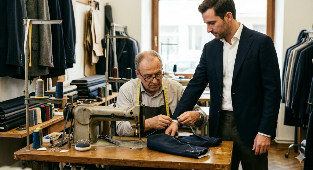 Nem todos os homens optam pela confeção total de raiz, e é aqui que a arte dos ajustes se torna crucial. Pequenas alterações num casaco ou numa calça de loja podem elevar drasticamente a qualidade percebida da peça.