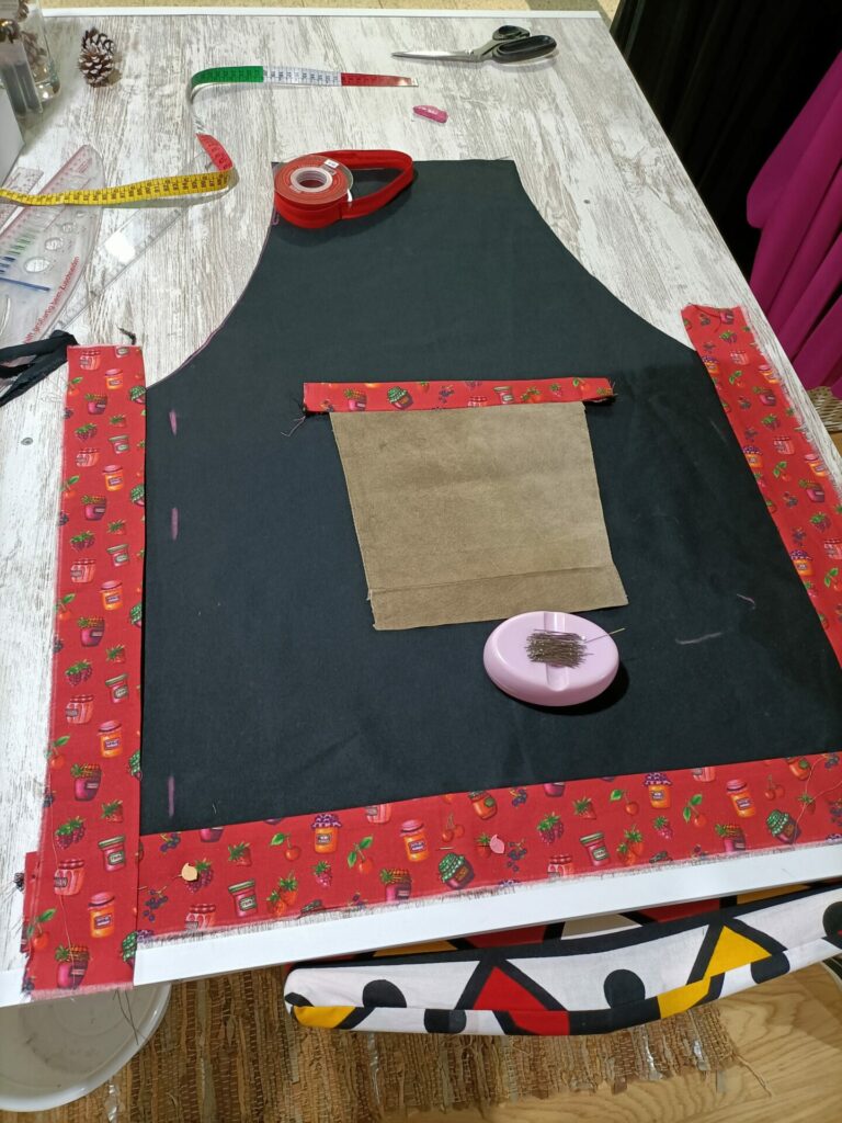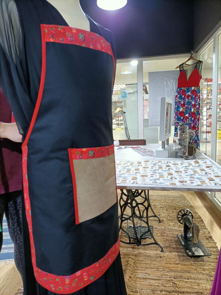 Adicione um toque de charme artesanal aos seus momentos na cozinha ou nas suas atividades criativas com este avental único, cuidadosamente confecionado à mão no Ateliê Mil Agulhas, em Coimbra. Combinando um tecido preto resistente com detalhes vibrantes em vermelho e uma divertida estampa temática, este avental une funcionalidade e estilo.