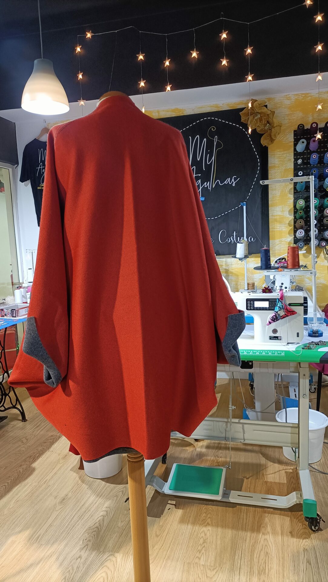 • A Capa: Confecionada num tom vermelho vibrante, apresenta um corte amplo e fluido que permite total liberdade de movimentos. O detalhe do debrum cinza nos punhos e bordas cria um contraste moderno e sofisticado.