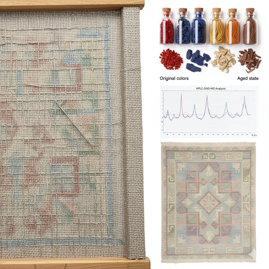 - A descoberta científica sobre a cor: As lãs eram tradicionalmente tingidas com substâncias naturais como a ruiva, cochonilha, índigo e pau-brasil. Análises cromatográficas recentes (com HPLC-DAD-MS) revelaram que a paleta original dos tapetes, que hoje se apresenta com tons pastéis suaves, era na verdade uma explosão de cores vibrantes e altamente saturadas. O envelhecimento dos corantes orgânicos perante a luz transformou, por exemplo, o vermelho potente da cochonilha em tons de ouro velho ou ocre desbotado.