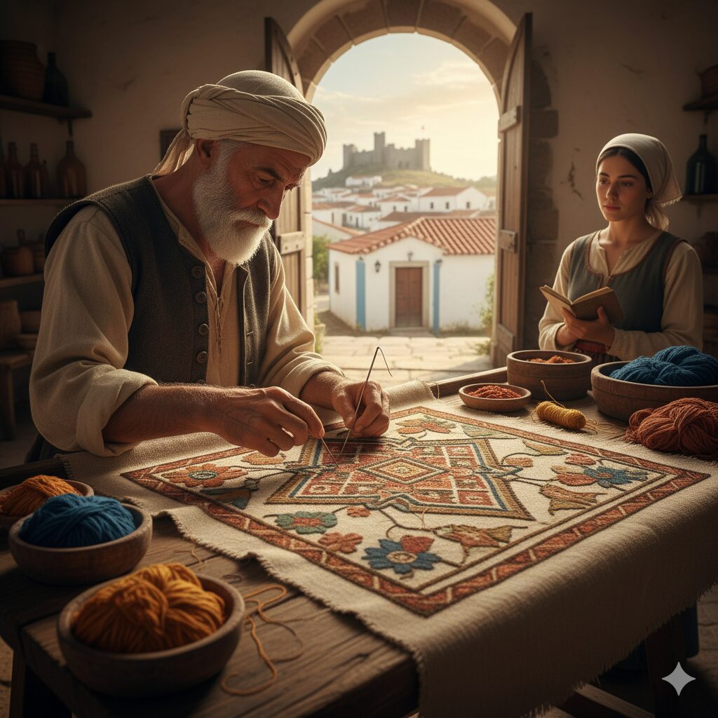 - O êxodo islâmico e a mudança técnica: A consolidação do tapete ocorreu entre os séculos XV e XVI. Com a expulsão dos Mouros de Espanha em 1492 e o Édito de Expulsão de D. Manuel I de Portugal em 1496, muitos artesãos islâmicos viram-se forçados a migrar para zonas rurais do Alentejo. Acostumados a fabricar tapetes atados com nós em grandes teares, e sem o acesso fácil a estas pesadas estruturas, estes artesãos transformaram o seu método: substituíram os nós pelo bordado com agulha, utilizando telas de linho ou cânhamo abundantes na agricultura local.
