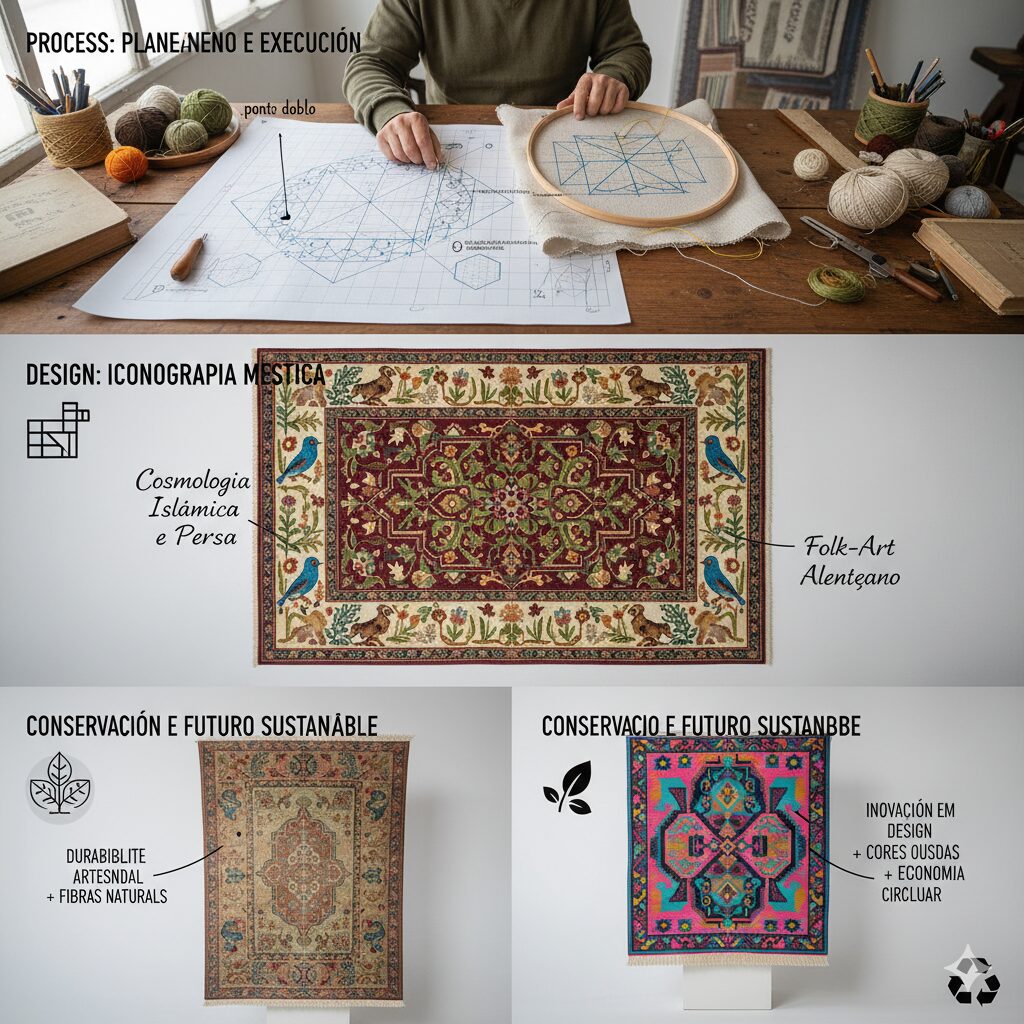 A tapeçaria de Arraiolos constitui um dos pilares mais resilientes e tecnicamente singulares da cultura material da Península Ibérica. Longe de ser um mero objeto utilitário ou decorativo, o tapete de Arraiolos é o resultado de uma profunda síntese cultural onde o rigor da geometria da tradição islâmica e persa encontrou o pragmatismo e a estética rústica da região do Alentejo, em Portugal.